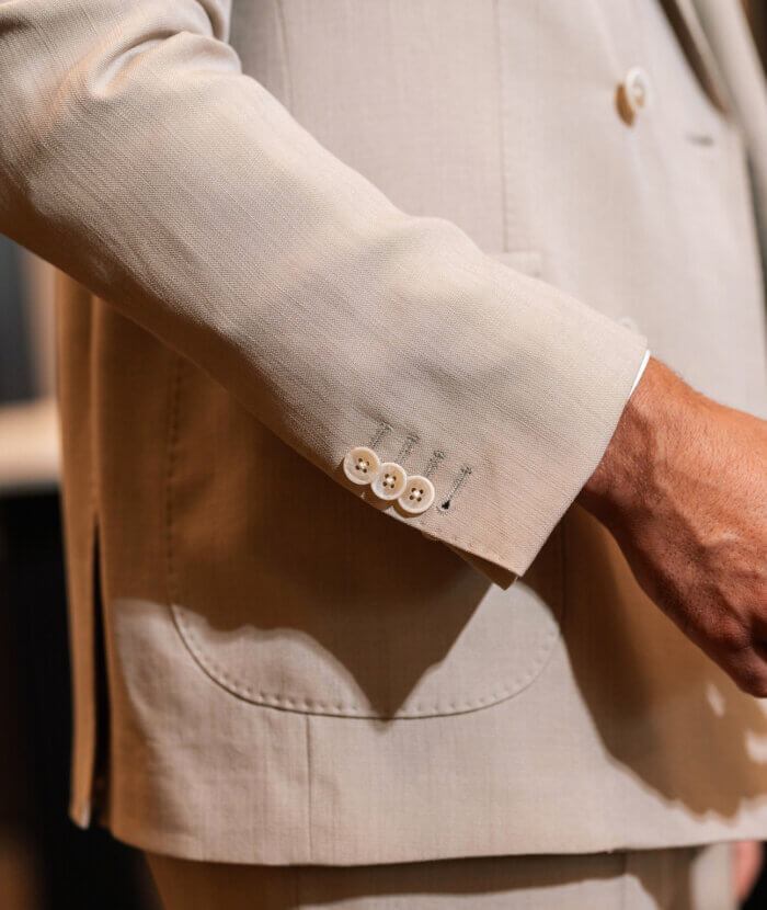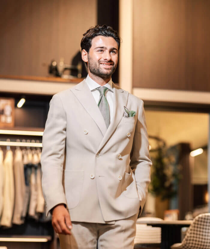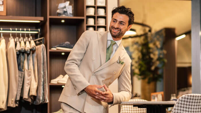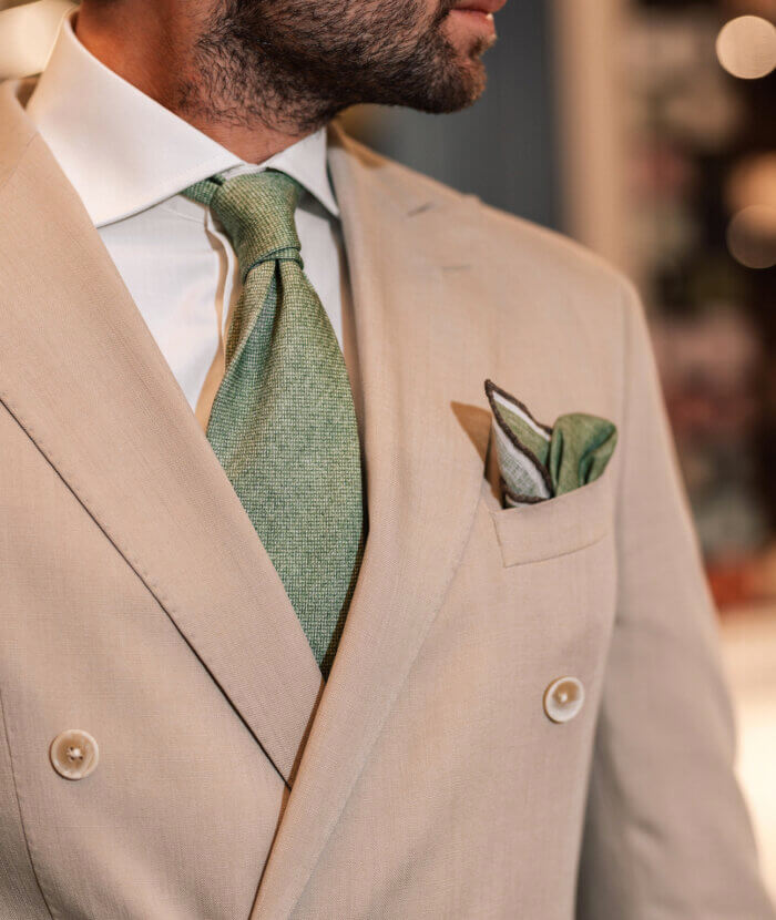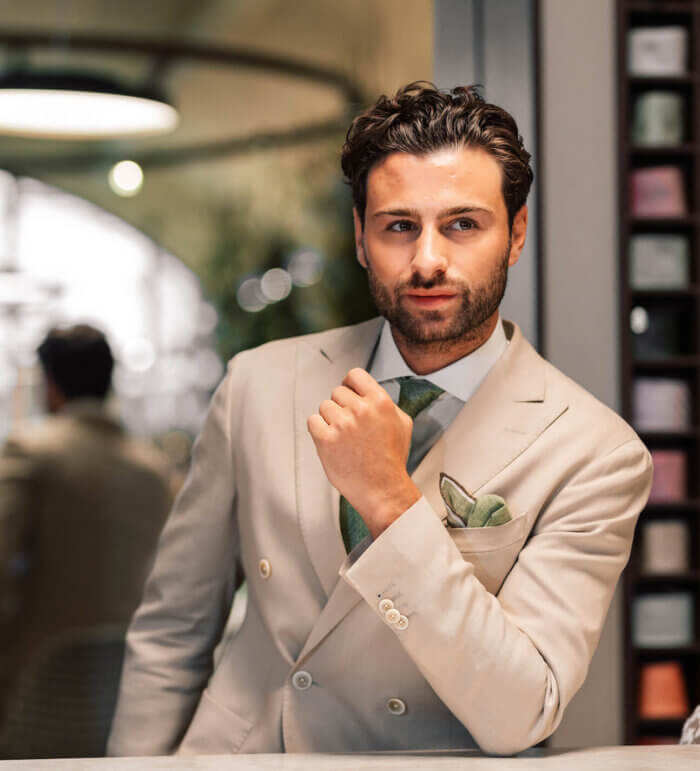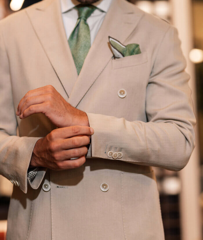 Je hebt een prachtig met de handgemaakt Italiaans design trouwpak aan.